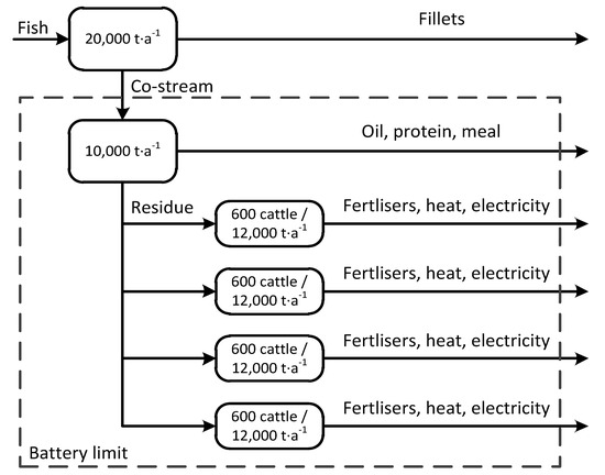 Fish aquaculture and slaughterhouses are situated near the shore in Northern Europe. More than 1,300,000 t of salmon is annually processed in slaughterhouse resulting in more than 400,000 t co-stream flows (heads, backbones, and viscera) [6]. The chosen battery limits for the modelled system are given in Figure 1.