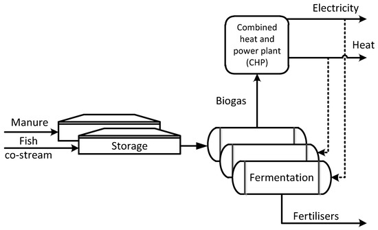 It is estimated that up to 50–75% of fish end up as co-streams in the seafood industry [5]. In Norway approximately 77% of fish processing co-streams are utilised, where 72% of the utilised amount is used for fish meal and silage production and ~13% for production of human consumption products [6,7]. In many countries, due to the lack of specialised infrastructure, co-streams are wasted or sent directly for animal feed without any attempt to recover the valuable components. However, these co-streams can be upgraded into more valuable products like w:3 rich oils, gelatine, and marine proteins [8,9]. Enzymatic and thermal treatment of animal-based co-streams lead to oil, protein, and sediment fractions, where the latter contain lipids, insoluble proteins, and the rest of the bones and scales [10,11,12,13]. The remaining sediments after the recovery of valuable products from fish co-streams contain a high concentration of nitrogen (N), phosphorus (P), and calcium (Ca) [14,15] and could be used for biogas production and bio-fertiliser generation [16,17]. Generated biogas has various applications, such as purification to biomethane [18,19], generation of biohydrogen [20], biomethanol [21,22,23,24,25], or used in fuel cells for power generation [26] and chemicals production [27]. The obtained digestate after anaerobic digestion could be used as an organic fertiliser for the fields of the farm [28,29,30,31]. The composition of the mixture of fish co-streams with cattle manure should be formed as nutrients for plant fertilisation [32,33]. Co-digestion of fish co-streams with cattle manure could improve the energy efficiency of biogas plant and fertilisation quality of the final digestate [34,35]. Energy balance of the system includes the total energy input, which comprises direct and indirect energy inputs [36] of the full cycle covering soil cultivation, biomass production, anaerobic digestion, and fertilisation of soil by the digestate [37].