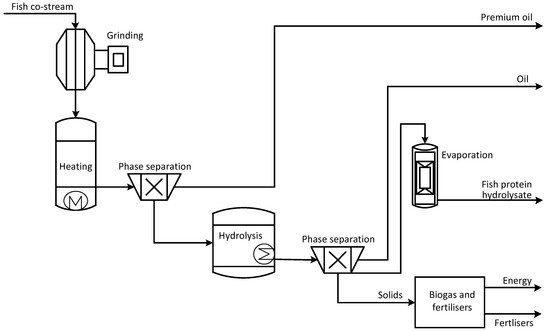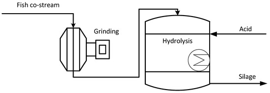 Fish silage to be used as an animal meal can be considered as the simplest processing method for fish co-streams, see Figure 3. The co-stream is processed by acidification and preserved in silage form [5,6,13,52]. First, the co-stream is grinded to decrease the particle size, and acid (formic acid) is added to reduce the pH to 3.5–4.0. The silage is stored in containers for several days or weeks. Low pH inhibits microbial activity but enables the activity of endogenous proteolytic enzymes from fish to hydrolyse, which liquefies material. Elevated temperature (to 50 °C) speeds up the reaction. Silage can be used as liquefied feed, typically for pigs.