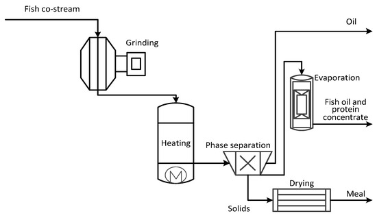 This concept covers the production of fish oil and protein concentrate (FPC), see Figure 4. The fish co-stream was minced to produce homogenous feed for the process. Thermal treatment (>90 °C) was used to fractionate the oil from the raw material, after which the individual phases were separated. For example, a tri-canter can be applied here. The separated phases were oil, protein-rich stick water, and meal. The aqueous phase (e.g., stick water) was evaporated to 50 wt.% concentration, and the meal was dried. The fish protein concentrate process is a common procedure in the industry [53]. Obtained products are typically used as animal feed.
