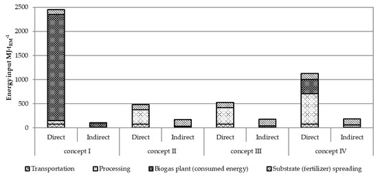 The results obtained after recalculation for 1 t of fish co-stream shows that energy input at biogas plant was higher in concept I than in concept IV, see Figure 6.