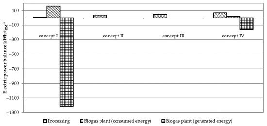After anaerobic treatment, the produced biogas was used for electricity production with a total generation of 1213 kWh·tRM−1 in concept I and 158 kWh·tRM−1 in concept IV (Figure 7). Internal usage in processing the fish co-stream and biogas plant operation reduced useful (ready to sell to the network) power to 1042 kWh·tRM−1 in concept I and 66 kWh·tRM−1 in concept IV. Concepts II and III consumed electric power for processing the fish co-stream, sequentially 41 kWh·tRM−1 and 51 kWh·tRM−1.