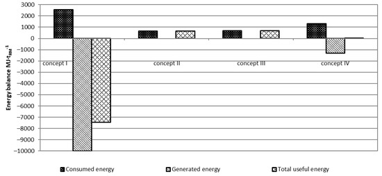 In concept II, the mass of the fish co-stream (meal) was 379 t per year and was used as animal feed; therefore, no energy was produced in this case. Processing of the fish co-stream to animal feed required 326 MJ·tRM−1.