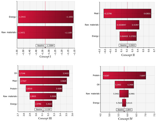 A sensitivity analysis was conducted to illustrate the most critical factor of economic evaluation. The prices of raw materials, energy, fish oil, fish protein, and fish meal were varied ±20%. (For example, the prices of mineral fertilisers and formic acid were considered to change according to variations in energy price.) Sensitivity analysis was based on the Monte Carlo simulations, with 10,000 iterations. Results of four different concepts are shown in Figure 9.