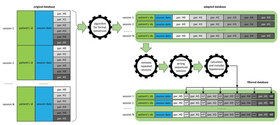 Finally, the last algorithm calculated, for each session, the supposed hypotension suffered by the patient, from the systolic and diastolic blood pressures measured in each of the hours of the session. The label ‘YES’ or ‘NO’ of the possible hypotension in each hour of the session was included in the database, as shown in the bottom side of Figure 1.