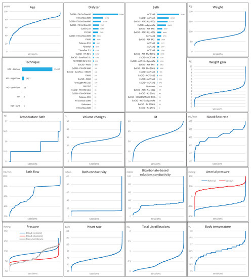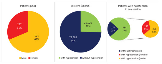 Figure 2 shows some basic statistics of the debugged database. There are 758 patients, 69% male and 31% female. These patients correspond to 98,015 hemodialysis sessions, taking into account that not all patients record the same number of sessions.