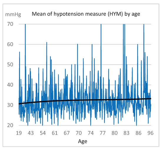 Once we calculated the possible hypotension values in all the sessions, we could see two interesting results. Firstly, Figure 3 shows, just for each patient who had a hypotension episode (584), the percentage of sessions where he/she suffered this episode with respect to the total number of sessions he/she was subjected to. For example, a patient who received 294 sessions, in 34 of which a hypotension happened, has a rate of 12%. In this graph, the patients are arranged according to the percentage obtained. Thus, for example, we observe that most patients (75%) with hypotension showed it in fewer than 40% of their sessions or that almost 10% of these patients showed hypotension in all the sessions they were submitted to. Secondly, another interesting result relates to the possible influence of age on the measurement of hypotension. Figure 4 shows the average systolic blood pressure drop (HYM) in the sessions where patients experienced hypotension, arranged according to the age of the patients. The different calculated trend plots (linear and polynomial) always show a slight rise in the measurement of hypotension as age increases.