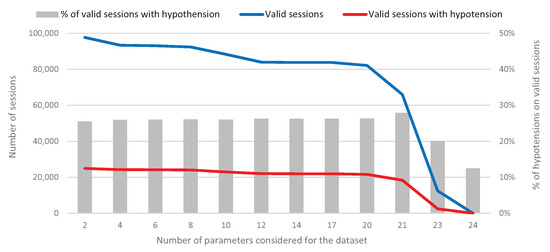 It is important to point out that, to build this dataset, only the sessions where all the values of the clinical parameters are valid have been taken into account, that is, parameters that have been correctly measured (they do not contain null values or values outside their own ranges). Not all sessions meet this condition; in fact, only between 12% and 28% of the sessions do, depending on the number of clinical parameters considered. The purpose of eliminating sessions with invalid data is to use datasets that generate the most robust prediction models possible. Obviously, this strategy will reduce the number of sessions available for the dataset, as shown in Figure 6.