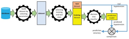 As shown in Figure 7, the training dataset is submitted to the classifier to build the prediction model. Later, we apply the test sessions to the prediction model, obtaining the predicted hypotension. Therefore, we can compare these predictions with the real hypotensions of the test sessions, calculating the success percentage, which we use as the accuracy metric for the prediction.