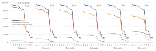 Given any dataset, a specific part of it will be used by the classifier to build the prediction model (training dataset), while the remainder will be used to check the effectiveness of the model (test dataset). To obtain robust conclusions, we considered different percentages of the dataset dedicated to the training, while the remaining dataset is dedicated to the test. Therefore, we applied six experimental cases with different percentages for the training dataset: 70%, 75%, 80%, 85%, 90%, and 95%. These different percentages obviously have an impact on the number of sessions devoted to training and testing, as shown in Figure 8. Although we observed that 95% allows more sessions to be devoted to training, the fewer sessions available to validate the prediction could yield misleading results, hence the reason for examining these six scenarios.