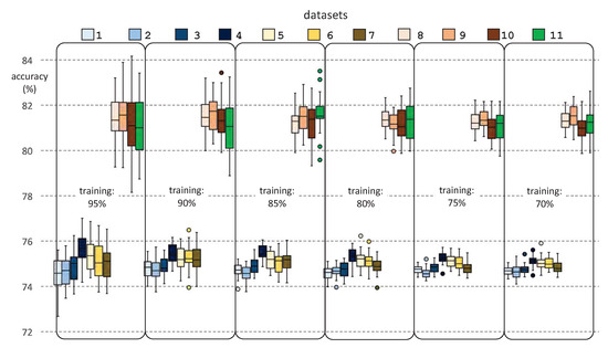 Figure 9 and Figure 10 show the results of the prediction accuracy by success percentages, for each dataset and for each percentage of training dataset, for DT and SVM classifiers, respectively. It should be noted that, for each chosen percentage for the training dataset, the corresponding test sessions were selected randomly, whereas the training sessions were the remainder. This stochastic element of the experimentation requires a statistical analysis of the results, by repeating several times the prediction for each dataset and percentage of the training dataset. To this end, we performed 31 runs of each prediction. The figure shows the minimum, maximum, mean, median, standard deviation, and outliers for each experiment.