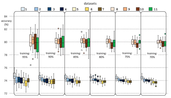 From the analysis of Figure 9 and Figure 10, we can draw interesting conclusions. Firstly, the prediction results are generally acceptable, in accuracy terms, where DT reaches slightly better results than SVM. Thus, we obtained mean accuracy rates ranging from 75% to 81% after applying DT, whereas these rates ranged from 74% to 80% when we used SVM. Secondly, we observed that the results of the last four datasets (“Datasets 8–11”) are very good, exceeding 80% of accuracy in all cases. This may be due to the robustness of their predictive models, since these datasets include more clinical parameters than the remaining seven datasets. From these four best datasets, we would choose “Dataset 10” as representative of the results of our research, since it has fewer outliers, less standard deviation, and a high number of clinical parameters considered. Finally, we found that the best results were obtained if we considered training datasets composed of 75% of the clinical dataset.