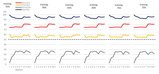 Table 3 summarizes some quality metrics for the classification, which help us to better analyze the prediction results. Having in mind that the positive and negative classes are the appearance or not of hypotension, respectively, accuracy measures the percent of cases in which the prediction was correct, whereas precision measures the quality of the classification model. Sensitivity shows how well the model can classify samples that have the condition, whereas specificity measures how well the model can identify true negatives. Following the above considerations, Figure 11 shows the mean values of the 31 runs for the quality metrics in the classification, according to the DT model and training size chosen.