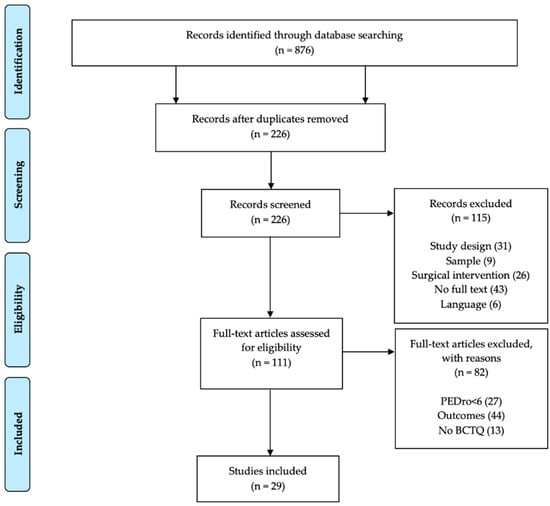 The literature search yielded 876 articles (PubMed: 155, Web of Science: 109; Scopus: 313; PEDro: 62; Cochrane: 237). After we eliminated the duplicated studies, 226 articles were selected for further analysis.