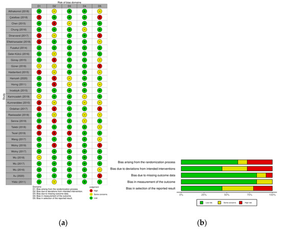 The RoB2 tools [20] showed that the aspects with the worst methodological quality in all the studies are found in the effect of assigning to the intervention and the results reported. Variable measurement seems to have the best methodical quality in all the studies considered (Figure 2a,b). Even though, it seems that good methodological quality was performed in the majority of studies.