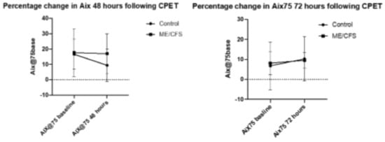 The main parameters this study aimed to observe were the changes in AIx75 and PWV in the ME/CFS cohorts 48–72 h after a maximal exercise bout. At baseline testing, the 48 h CFS and control group produced comparative AIx75 measurements, as did the 72 h CFS and control group. At 48 h recovery time, the CFS group had experienced very little change in mean AIx75 from baseline, but the control group had experienced a significant reduction in mean AIx75. Healthy populations have shown to experience improvements in AIx75 with only short-term intervals of moderate to high intensity exercise [