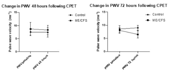 31]. No current literature exists on observing changes of PWV with exercise in ME/CFS patients, but other studies have iterated that even a single bout of exercise from a stress test can elicit minor improvements (–0.22 ± 0.3 ms