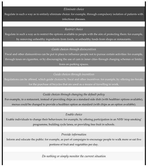 - Griffiths, P.; West, C. A balanced intervention ladder: Promoting autonomy through public health action. Public Health 2015, 129, 1092–1098. [Google Scholar] [CrossRef]