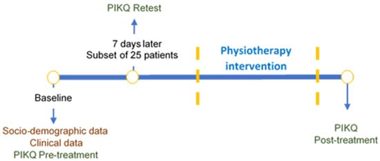 At baseline, all women (from patients’ and experts’ group) completed the Spanish PIKQ, and their sociodemographic and clinical data were collected. One week later, from the patient group, a subsample of 25 women filled in the PIKQ again, in order to analyze the test–retest reliability. No treatment was delivered during this time; this interval was chosen to ensure that women’s knowledge remained unchanged and long enough to ensure that they would not recall their baseline responses. Women from the patient group, after performing a pelvic physiotherapy treatment that included a pelvic health educational strategy, were supplied again with the PIKQ to evaluate responsiveness (Figure 1). The average time was recorded.