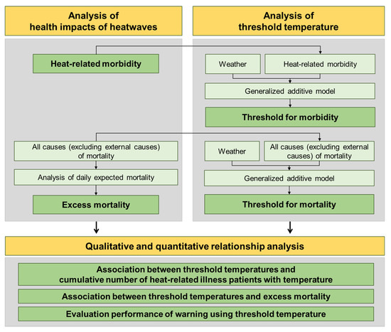 The study procedure is shown in Figure 1. First, heat-related morbidity and excess mortality were analyzed as proxies of health impacts from heatwaves. Next, a threshold temperature for heat-related morbidity and a threshold temperature for mortality were analyzed. Finally, the association between threshold temperatures and health impact proxies were analyzed in three ways. (1) The cumulative number of HRI patients with increasing temperature was compared to the two threshold temperatures. (2) The daily excess mortality was also qualitatively compared to the two threshold temperatures. (3) The performance of warning based on threshold temperature was evaluated using the model skill score.