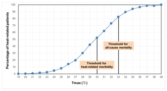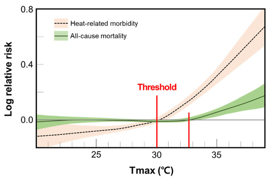 The effects of maximum temperature on heat-related morbidity and mortality showed a pattern as shown in Figure 2. The heat-related morbidity had a pattern of increasing rapidly from a relatively lower temperature than mortality. The threshold temperature for heat-related morbidity was 30 °C, while the threshold for mortality was approximately 33 °C.