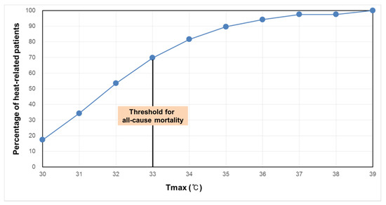The comparison between the cumulative number of heat-related morbidity with respect to the two threshold temperatures shows that most of the heat-related morbidity already occurred before the temperature reached 33 °C (Figure 3), which is the threshold temperature for mortality. Even if the cumulative number of heat-related morbidities was only counted above 30 °C, 53.5% of heat-related morbidity occurred before 33 °C (Figure 4).
