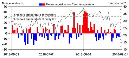 The graph comparing the daily excess mortality occurrence and the two threshold temperatures shows that the threshold temperature for heat-related morbidity has a limit to the warning of the risk of mortality. In Figure 5, the bar graph indicates the excess mortality. The red bars indicate the days when the number of deaths was greater than the expected deaths. Blue bars indicate fewer deaths than expected. The days when excess mortality increased dramatically appeared in 24 July, and between 1 and 4 August. During this period, the daily maximum temperature remained above 33 °C. It was difficult to find a definite increase in excess mortality within the temperatures between 30 °C and 33 °C. The threshold temperature of heat-related morbidity is difficult to use to warn of the risk of death from heatwaves.
