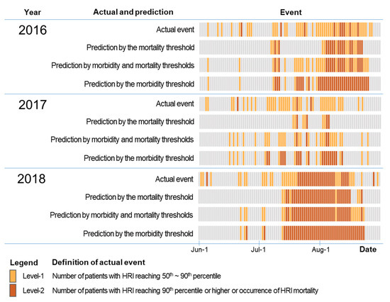 Comparison of actual and predicted heat-related illness (HRI) events: the actual event was based on monitoring data in the emergency department of the hospital; predicted events were determined according to types of the threshold.