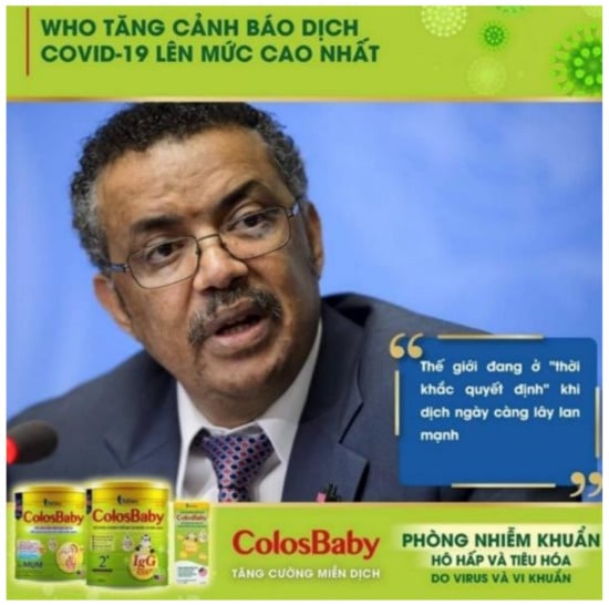 In the Colosbaby Facebook post in Vietnam, an advertisement featured a headshot of WHO Director-General Dr Tedros Adhanom Ghebreyesus, with the captions: “WHO raises COVID-19 threat warning to its highest level” and “The world is entering a decisive moment when the coronavirus disease is spreading rapidly” (Figure 2) [40]. The statements explicitly linked the product’s immunological claims to the fight against COVID-19, which created an impression that the product can help to fight the virus. The unauthorized use of a picture of the WHO Director-General falsely represented the product as being endorsed by the highest authority on health, which was an attempt to align the product with an international public health establishment to gain legitimacy.