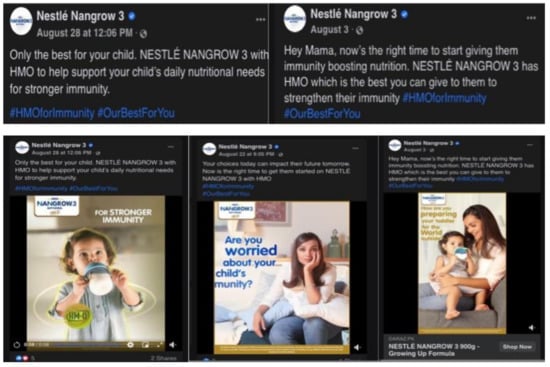 In Pakistan, Nestlé used the high number of confirmed COVID-19 cases as a selling point. A series of short videos have appeared on Nangrow Pakistan’s Facebook page showing a toddler, each with taglines that make an indirect reference to COVID-19, asking parents whether they are worried about their child, how they are preparing their child for the world outside, and how Nangrow’s HMO (human milk oligosaccharides) can help boost their immunity (Figure 2) [41,42,43].