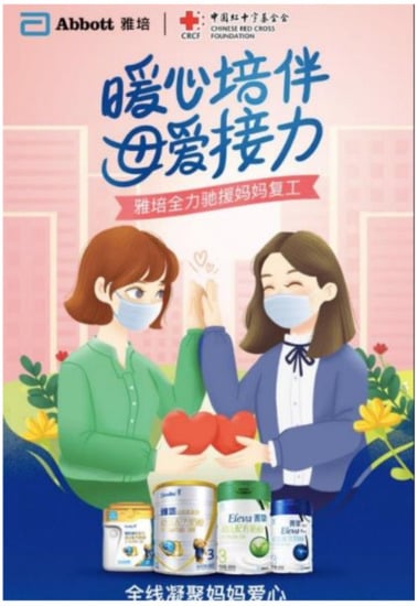 - Zhāng, X. Juānzèng yíngyăng lĭbāo yăpéi quánlì chíyuán māmā fùgōng [Donate Nutrition Packages, Abbott Fully Supports Mothers Returning to Work]. Běijīng Tóutiáo. 20 March 2020. Available online: https://app.bjtitle.com/8816/newshow.php?newsid=5576384&typeid=13&uid=1&did=&mood= (accessed on 20 September 2020).