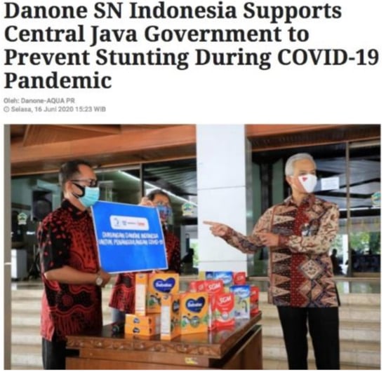 A screenshot of a news article about Danone’s donation of formula products (including Bebelac and SGM) to Central Java government in Indonesia.