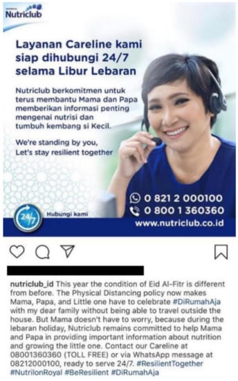 In Indonesia, Nutricia (owned by Danone), manufacturer of Nutrilon and Bebelac, offered a 24/7 hotline service during Eid Al-Fitr (Muslim religious holiday) through its careline Nutriclub (Figure 7) [55]. The tagline “we’re standing by you, let’s stay resilient together” was used in an Instagram post as a reference to the physical distance policy that imposed traveling restrictions during the holiday. While the tagline was an indirect reminder of the social isolation from friends and family, it also suggested solidarity with parents amid the pandemic. As part of the purported message, the post told parents “not to worry” as it iterated Danone’s commitment to providing parents with important child nutrition information.