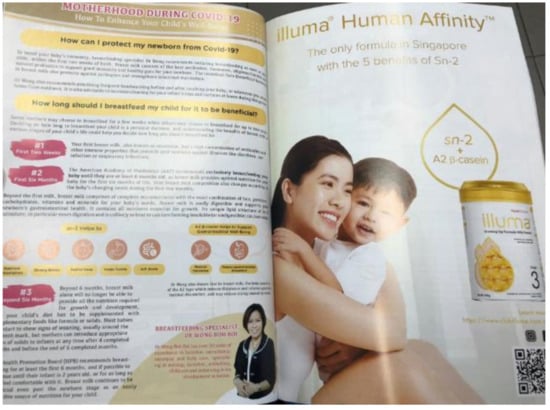 In Singapore, Illuma (owned by Nestlé) invested in a full-page advertisement in a mother’s magazine dedicated to the benefits of breastfeeding (Figure 8) [58]. The content appeared to be an informative article, with advice from a breastfeeding specialist on breastfeeding topics such as “How can I protect my newborn from COVID-19?” and “How long should I breastfeed my child for it to be beneficial?” The information made references to breastfeeding and the properties “sn-2” and “A2 beta-casein”, and statements such as “nutrient absorption”, “strong bone”, and “support gastrointestinal well-being”. Yet, paradoxically, next to that was a full-page advertisement of Wyeth’s Illuma 3, described as “human affinity”. The page featured benefit icons “sn-2” and “A2 beta-casein”, the same properties referenced in the page about benefits of breastfeeding, and a tagline, “the only formula in Singapore with 5 benefits of Sn-2”. When reading the two pages together, it became clear that Nestlé was allying its product with the superiority of breastfeeding, and then stressing the product’s similarity to breastmilk. Thus, the more it promoted breastfeeding, the more their product was promoted.