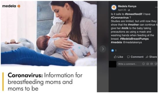 - Medela Kenya [@MedelaKenya]. Is It Safe to #breastfeedif I Have #Coronavirus? Facebook. 25 April 2020. Available online: https://www.facebook.com/MedelaKenya/photos/118345433170885 (accessed on 20 September 2020).