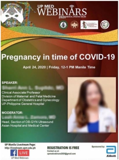 - UP Med Webinars [@upmedwebinars]. Pregnancy in the Time of COVID-19. Join Our Webinar Tomorrow, April 24, at 12 NN! Facebook. 23 April 2020. Available online: https://www.facebook.com/upmedwebinars/photos/bc.AbovlJvn9Yz7phRfX5Wun1pSvEiEyvmi8sEJLeWKyx75NoRWgmVZ0sxbgW4CY4WDBVbVqC_0NUBivJBBgAcGBJ2gfQ5Dq1remEGjSt632nceO93A0ujVqGDkYmz6YL4QTeU0JOiURdXJcBQvfTpLusmG/2598700883568925/?opaqueCursor=AbpL_3mwMxMjOPpzMACdYasFy862HL8y1dcu_dJLL28mPoRisy9rSvTKiO_5m4vp1IDflv6JQQUeP8AHDghvPtLgQS1Oug_la260zMCh3PrO6JnXKYIWEfIjqxIPCYEx0u94JncI7Ke4hHMTXvdRQuPFluFaL-Au7pvTmyMDEuxt-YwZUIwi5K3C4PAF_2NL4qVeCCWnM7g37Kz_juIEil4vflu4W4IAyNlVI-M9U5BiPMSTRVPSXtuMNTS16LTkH2ihsteS6yxd9pz4HH8kKT-ozHjFg3jFgVZVRzUHn4uaIR8ROLaA7sC8HzVBju3rs-bJrWxzPEj_a1aqCo4rUQ37e3GqYm6MefBPA3jJlv5m3iQrr40gv7eAHowOwh65Sy_Ka-E1DhprC34QO7Ua6WZ0hwOi3VmzL5IVA0rYTWms_lLwR3BZk8D2m9zkocT1_VXCHfYfP1ML-bSGdqWxCNS6ttpvBQlwPr0MIoxUE8bHCVVSlnP-xhB-r2R6axJkZc8FIN29L5PTjsw1x3cTi9_sQ-3sv9RUFAIJ7oA-KJMcEw (accessed on 20 September 2020).