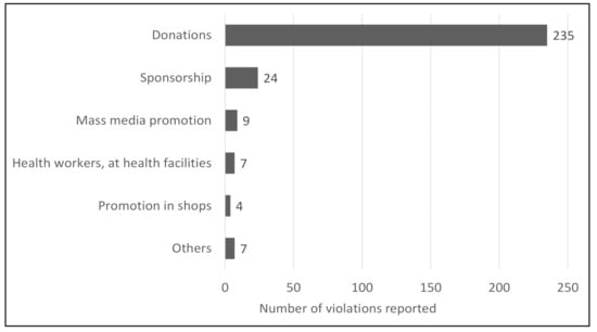 Since the onset of the outbreak, there have been rampant donations of BMS at municipal level in the Philippines [69]. This is supported by data contained in the official national database of reported Code violations or aggressive marketing activities from January 2019 to July 2020 [49]. The government declared a state of public health emergency and imposed strict social distancing measures in early March 2020 and, from March to July 2020, there were a total of 291 reported violations, a sharp increase from previous months. In the whole of 2019, only 70 complaints were received, and one reported case in January 2020 (Figure 12).