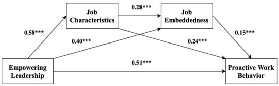Furthermore, the analysis investigated the indirect effect of empowering leadership on employee proactive work behavior via job characteristics and job embeddedness and percentile bootstrapping. Bias-corrected percentile bootstrapping was signified with 10,000 bootstrap samples at a confidence interval level of 99% following Taylor et al. [108]. The first indirect path of empowering leadership affects proactive work behavior and job characteristics had a mediating role in the relationship between empowering leadership and proactive work behavior (β = 0.14, p < 0.001). The lower and upper bounds of the 99% CI did not comprise 0 [lower bound CI = 0.09, upper bound CI = 0.20]. Therefore, Hypothesis 5 was supported. The results also demonstrated that the effect of empowering leadership on proactive work behavior was also mediated by job embeddedness (β = 0.06, p < 0.001). The lower and upper bounds of the 99 percent CI did not include 0 [lower bound CI = 0.02, upper bound CI = 0.11], supporting Hypothesis 6. Eventually, the results from the serial mediation analysis indicated a serial mediation model of job characteristics and job embeddedness in the relationship between empowering leadership and proactive work behavior. Linking empowering leadership and proactive work behavior through job characteristics and job embeddedness was significant (β = 0.02, p < 0.001). The lower and upper bounds of the 99 percent CI did not involve 0 [lower bound CI = 0.01, upper bound CI = 0.05]. The interpretation is that job characteristics and job embeddedness are variables that explain why employees tend to perform a higher level of proactive work behavior. Consequently, Hypothesis 7 was supported (see Table 5).