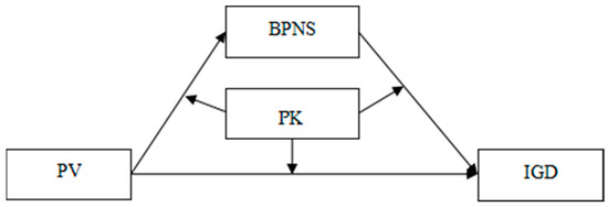The proposed mediated moderation model. Note: PV = peer victimization, PK = parental knowledge, BPNS = basic psychological needs satisfaction, and IGD = Internet gaming disorder.