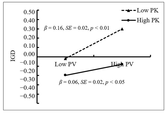 IGD among adolescents as a function of peer victimization and parental knowledge. Note: PV = peer victimization, PK = parental knowledge, and IGD = internet gaming disorder.