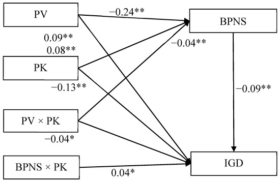 Model of the moderating role of parental knowledge in the indirect relationship between peer victimization and IGD. Note: PV = peer victimization, PK = parental knowledge, BPNS = basic psychological needs satisfaction, and IGD = internet gaming disorder. Values are standardized coefficients. * p < 0.05, and ** p < 0.01.