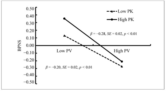 Basic psychological needs satisfaction among adolescents as a function of peer victimization and parental knowledge. Note: PV = peer victimization, PK = parental knowledge, and BPNS = basic psychological needs satisfaction.