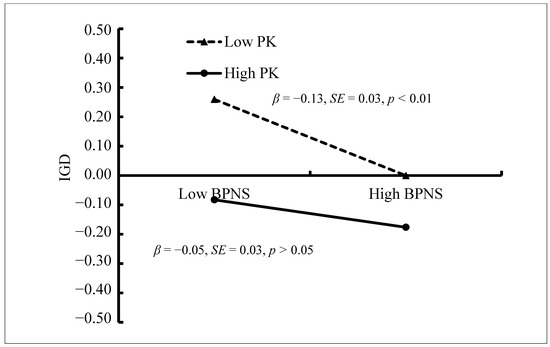 IGD among adolescents as a function of basic psychological needs satisfaction and parental knowledge. Note: PK = parental knowledge, BPNS = basic psychological needs satisfaction, and IGD = internet gaming disorder.