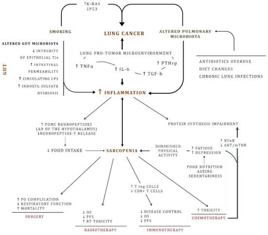 Lung cancer risk factors: focus on inflammation chronic inflammation, and sarcopenia. In addition to smoking, lifestyle (diet change, physical activity, pulmonary and gut microbiota) represents a risk factor postulated to contribute to lung cancer origin. The resulting inflammation ignites the carcinogenesis. On the other hand, inflammation is sustained in the tumor microenvironment, closing the vicious circle. Likewise, gut plays a key role. An impaired intestinal mucosa and an altered gut microbiota promotes inflammation. With time, skeletal muscle weakens. Physical inactivity combined with inadequate diet exacerbates the scenario and sarcopenia development. AKT: Protein kinase B; AN: Arcuate nucleus; IL-6: Interleukin 6; mTOR: mammalian target of rapamycin; NFκB: Nuclear factor kappa-light-chain-enhancer of activated B cells; LPS: Lipopolysaccharides; OS: overall survival; PFS: Progression-free survival; PO: Post-operative; POMC: Pro-opiomelanocortin; PTHrp: Parathyroid hormone-related protein; RT: Radiotherapy; TJs: tight junctions; TGF-β: Transforming growth factor beta; TNFα: Tumor necrosis factor alpha.