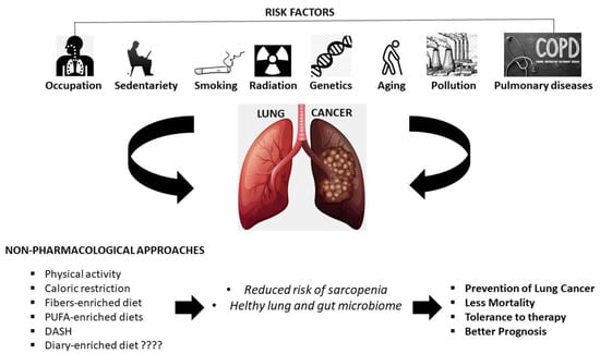 Non-pharmacological approaches acting on lung cancer incidence and management. Regular physical activity, caloric restriction, fibers-enriched diet, PUFA-enriched diets, DASH and diary-enriched diet may reduce the risk of sarcopenia and influence lung and gut microbiome resulting in decreased cancer incidence, reduced mortality, tolerance to therapy and a better prognosis.