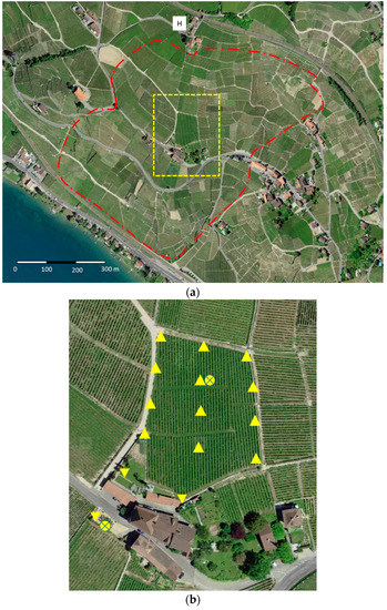 The field measurements were carried out on 7 June 2018, between 11:00 a.m. and 1:00 p.m., during the skimmed milk treatment of a vineyard located in the Lavaux region (canton of Vaud, Switzerland, 46°29′57.8″ N 6°42′23.5″ E). The treated area is shown in Figure 1a. This region is very steep, which makes access to vehicles in the vineyards difficult and makes treatment by helicopter attractive despite its cost. Treatment of the area took about 2 h, during which time the helicopter treated about 50 hectares, flying back and forth between the treated vineyards and the refill area (marked H on the map). The helicopter used on the day of the treatment was a AS350 B2 (Airbus Helicopters, France).