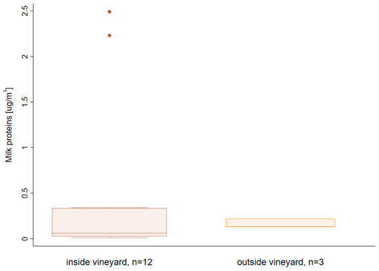 Air concentrations measured during and shortly after treatment are shown in Figure 2. The average concentration in cow milk proteins observed over all measurements was 0.41 μg/m3 (n = 15, SD 0.8 μg/m3), with average concentrations inside and outside the vineyard of 0.47 and 0.16 μg/m3, respectively. This difference is mainly due to the greater variability of concentrations inside the vineyard, illustrated by the presence of two outliers in the order of magnitude of 2 μg/m3. Apart from these two outliers, it is interesting to note that the air concentrations in the living area near the vineyard (0.13–0.22 μg/m3) were close to those observed in the field.