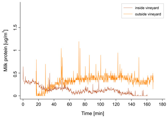 Cow milk proteins concentrations in air during treatment (t = 160 min) inside and outside the vineyard.