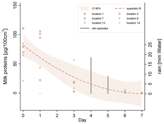 Overall, the milk deposits showed some persistence during the first 3 days, with concentrations of the order of 10–100 μg/100 cm2, and low persistence in the medium term, with concentrations not exceeding 2 μg/100 cm2 after 7 days. It should be noted that rainfall events during days 4, 5 and 6 probably contributed to the accelerated removal of the milk deposits from the leaves.