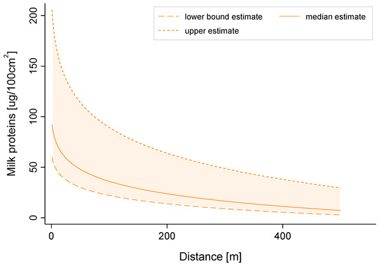 In regard to the surface concentrations of lactose on the leaves of the plant, our results indicate that the amount of milk proteins after treatment inside and close to the treated area was of 10–100 μg/100 cm2. Milk proteins were still present on the surface of the leaves several days following spraying. Three days after treatment, they became very low, either due to leaf absorption or natural degradation. The simulation results indicate that surface contamination downwind of the vineyard could remain within the same order of magnitude of 100–200 m.